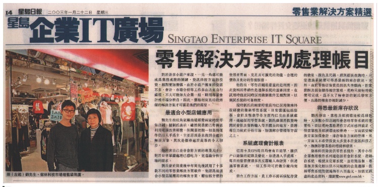 前台工作方面,員工亦不需再強記存貨的數量、顏色及尺碼,遇到顧客查詢時,只需透過系統便可得悉最新的庫存狀況。另外,由於零售店售貨員的流失率頗高,計算薪酬及佣金顯得相當繁瑣,現時只需短時間便可完成,為不大了解會計的劉氏帶來方便,出錯的機會亦相對減少。 劉氏指出,業務及經濟環境較為理想時,大多數小型店舖均會忽略零售系統的重要性,並以現時業務運作方式而感到滿足。但當業務及經濟環境較差時,一方面需要解決方案加強會計、庫存等各方面的管理,另一方面又不希望投資太多資本於資訊科技之中,漸漸影響業務的穩健和發展。 傲林科技除提供零售系統外,其中小型企業應用軟件系列還包括有會計系統、進銷存系統、報價及訂單系統,並有簡易版、專業版及強化版以供不同規模的企業選擇。傲林零售系統售價為HK$4800。如需更詳盡的產品資料,請瀏覽http://www.gtcl.com.hk。