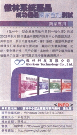 《傲林中小型企業應用軟件─強化版》已於2002年8月30日通過中國軟件評測中心的登記測試,其中包括:多公司管理系統、會計系統、進銷存系統和報價及訂單系統等主要功能,顯示在安裝與卸載、功能、安全穩定性、用戶介面、本地化、用戶文檔及病毒檢查共7方面,皆可滿足現今商業應用需求。